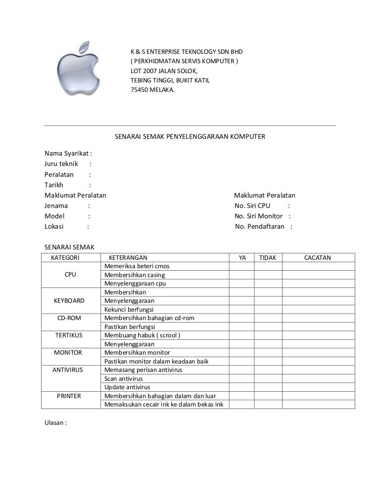 Borang Penyelenggaraan Dan Senarai Semak Komputer Pdf